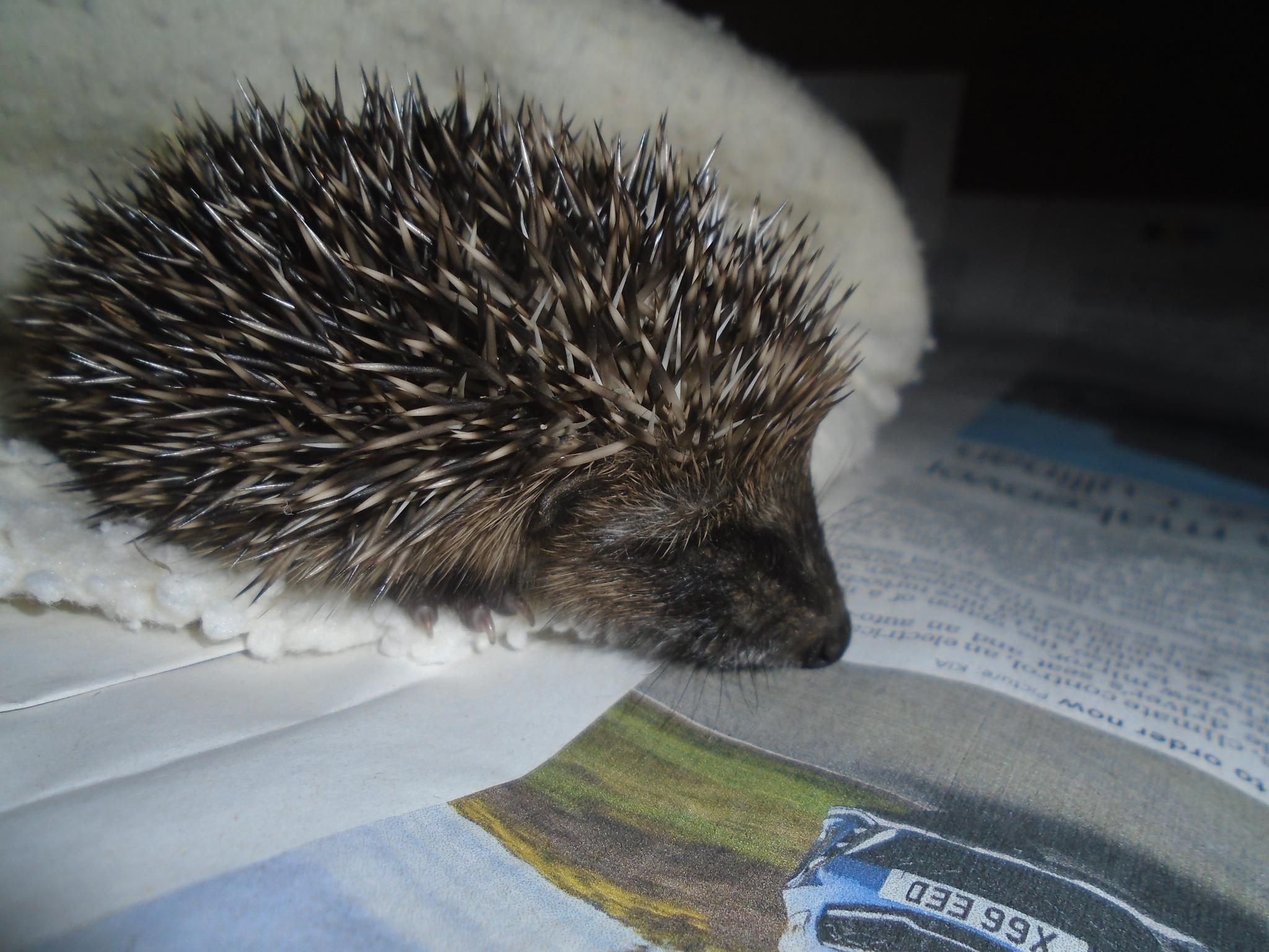 • Look who has been rescued from falling from a high hedge at the top of Mont Cochon. He is between 3 and 4 weeks old he has teeth at the back but not at the front, he should still be with his mum, he has a patch of missing spines and what looks like a bite on his back so maybe the nest has been raided and he escaped? He is doing well and lapping for himself and eating a few solids too.