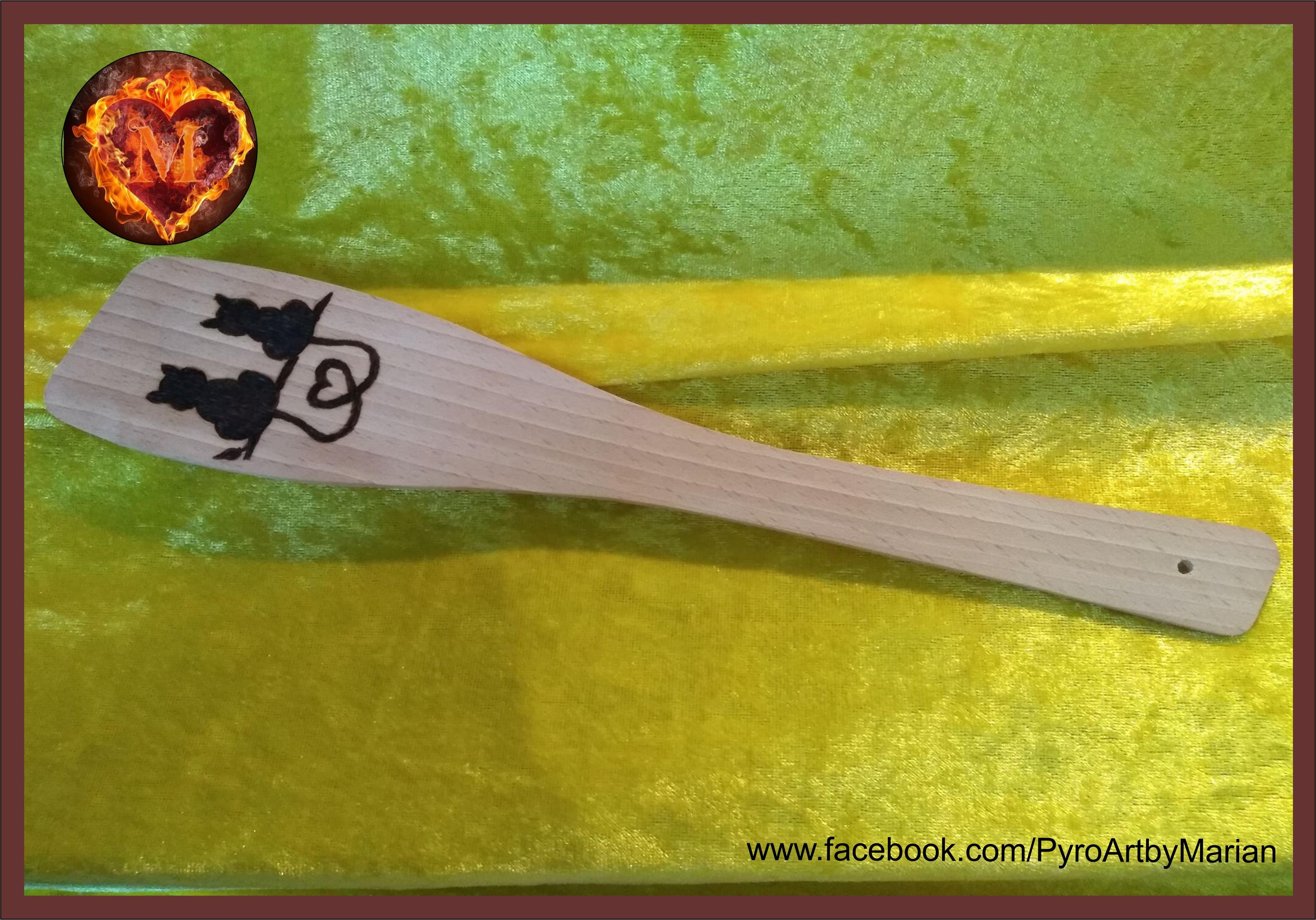 Medium recycled spatula, or spoon, ♻ perfect for today's environment, and perfect for the cat lover in your lifeHand drawn, pyrographed and finished in a food safe oil so it can be used everyday. If you want it just to look pretty on your worktop or wall, please let me know and I will put a few coats of varnish on it, so it doesn't become a dust magnet, but bear in mind you will not be able to use it for your cooking after this process is done. It's usually a good idea to give wooden kitchen utensils a coat of oil every once in a while to stop the wood completely drying out, and giving them a longer life. I would recommend coconut oil ☺ Message me or for ease of shopping visit my website https://pyroartbymarian.sumupstore.com, drop by the Crafty Ouens markets or Reg's Garden - St. Brelade