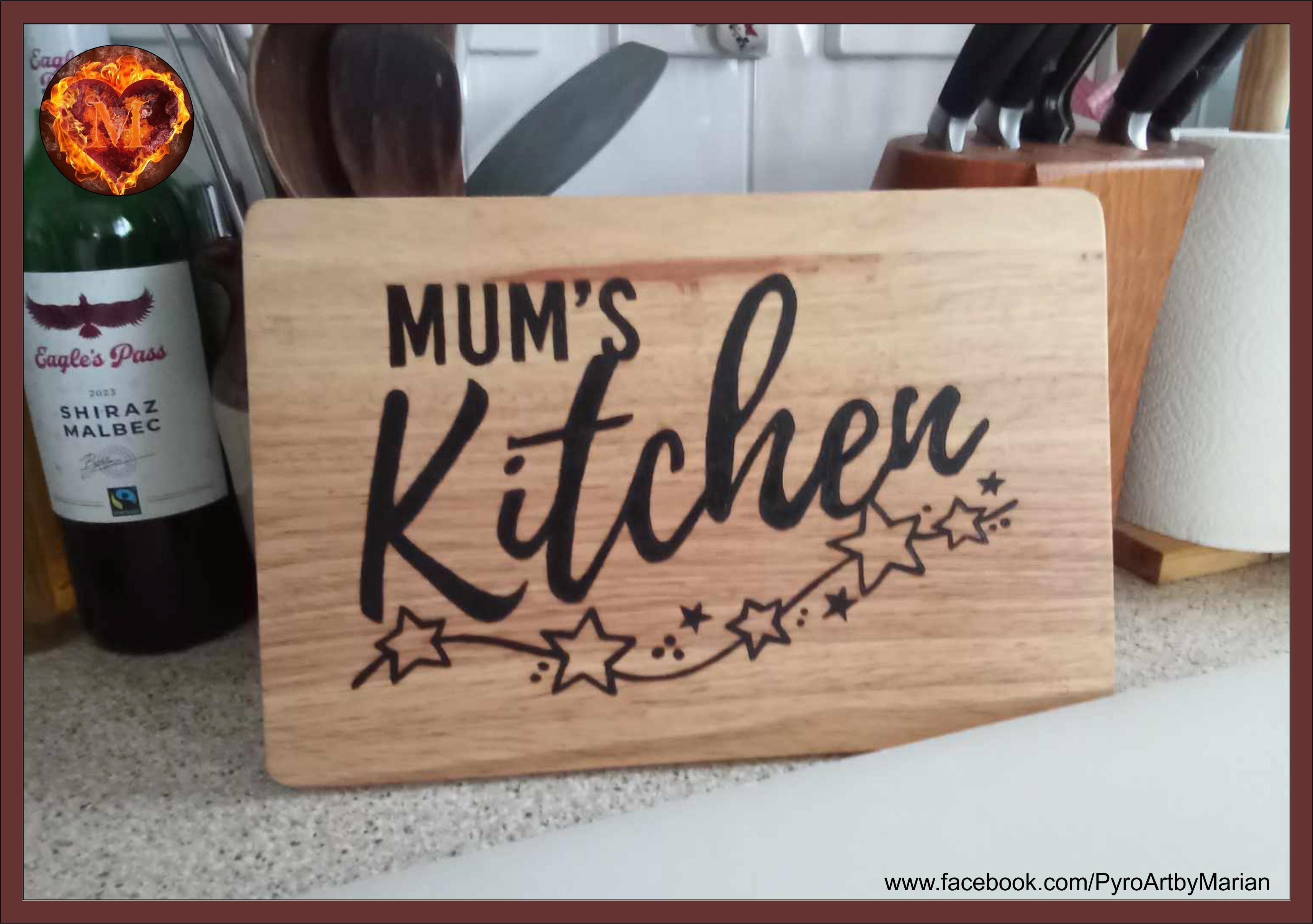 Mum's Kitchen 💖 It doesn't have to be Mother's Day to show your Mum just how special she is to you. Remind her how much you appreciate the work she puts in to providing your meals! This board can have any name burnt on to it. Hand drawn, pyrographed and finished with food safe Tung oil. You'll not find this on the High Street! Message me, or for ease of shopping, visit my website https://pyroartbymarian.sumupstore.com/, drop by the Crafty Ouens markets or Reg's Reg’s Garden - St Brelade 😘 REMEMBER ~ BUY LOCAL... SUPPORT LOCAL 🥰 Help me out ~ ✔️ Post your thoughts on this ✔️ Pass it on ✔️ Add yourself with a tag ✔️ Be my friend ✔️ Message me with any questions ✔️FOLLOW me to stay in touch PLEASE... Say something and share when you see a post, it helps everyone to see my work. Thank you and I hope you like and enjoy my work, be my inspiration 🧡 #choppingboard #kitchenware #gifts #handmade #pyrography #bamboo #sustainability #pyroartbymarian #craftyouens #regsgardenstbrelade #jerseyci